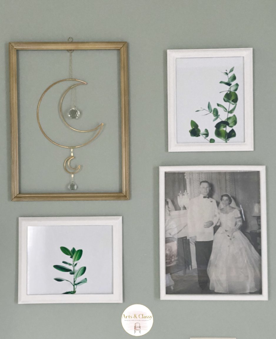 I looked for a lot of my artwork and picture frames at thrift stores. For example, the birch tree art piece at Goodwill is for $6.99. The frames for my art were also sourced from thrift stores. I used them to create an art collage in my home blogger office.