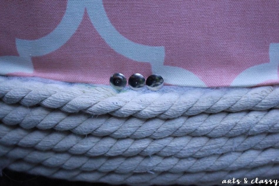 On a whim I decided to clean up my edges with some chic looking thumb tacks. Once stuck in the tire, they were not coming back out. I love the decorative look it gave this piece.