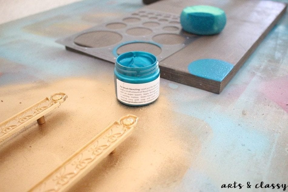Take the circle stencil, stencil creme, and sponge. Create a polka-dotted pattern with handles for your DIY serving tray.
