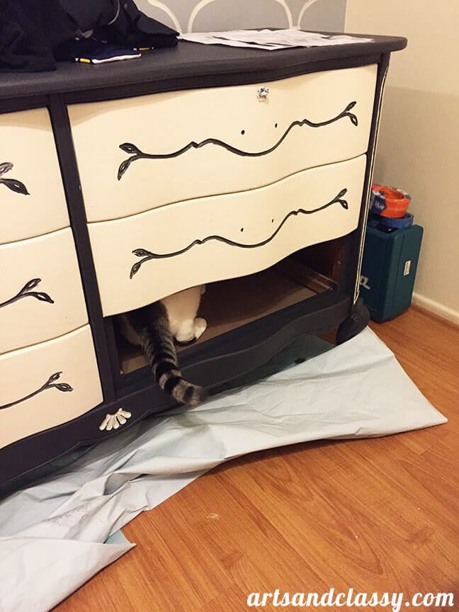 I removed the dresser hardware and drawers. This part made my kitties very happy. A new place to explore!