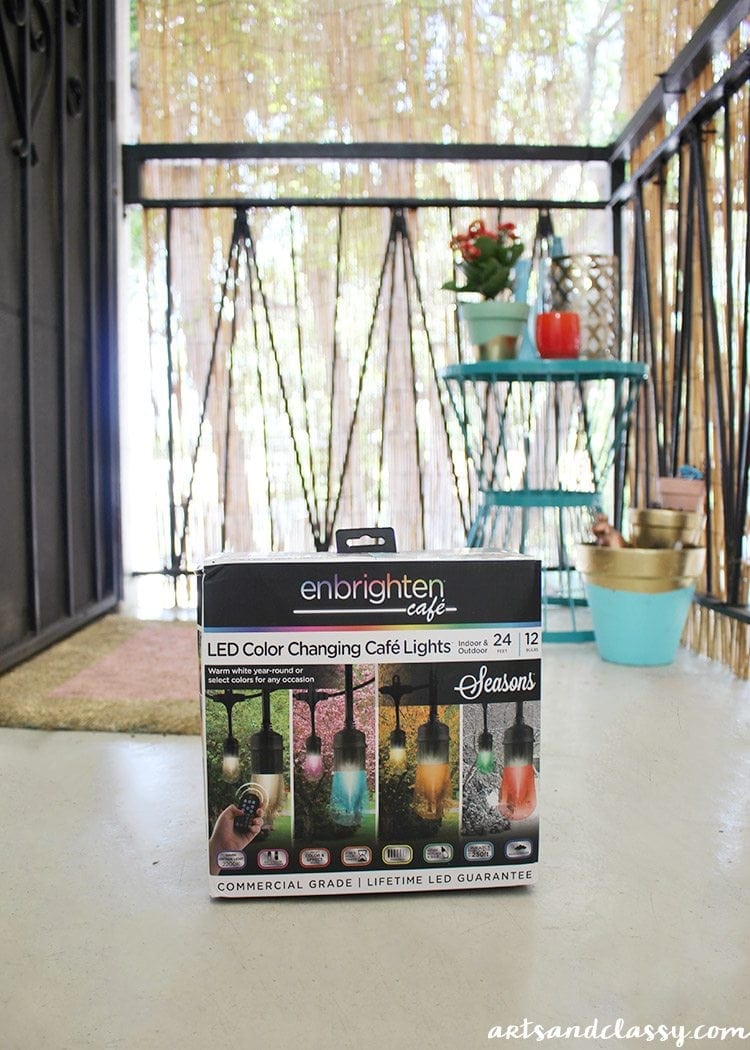 Once I had that project started, it was time to break out the amazing lights I decided to use for this patio makeover. Check out Enbrighten Seasons Color Changing Café Lights.