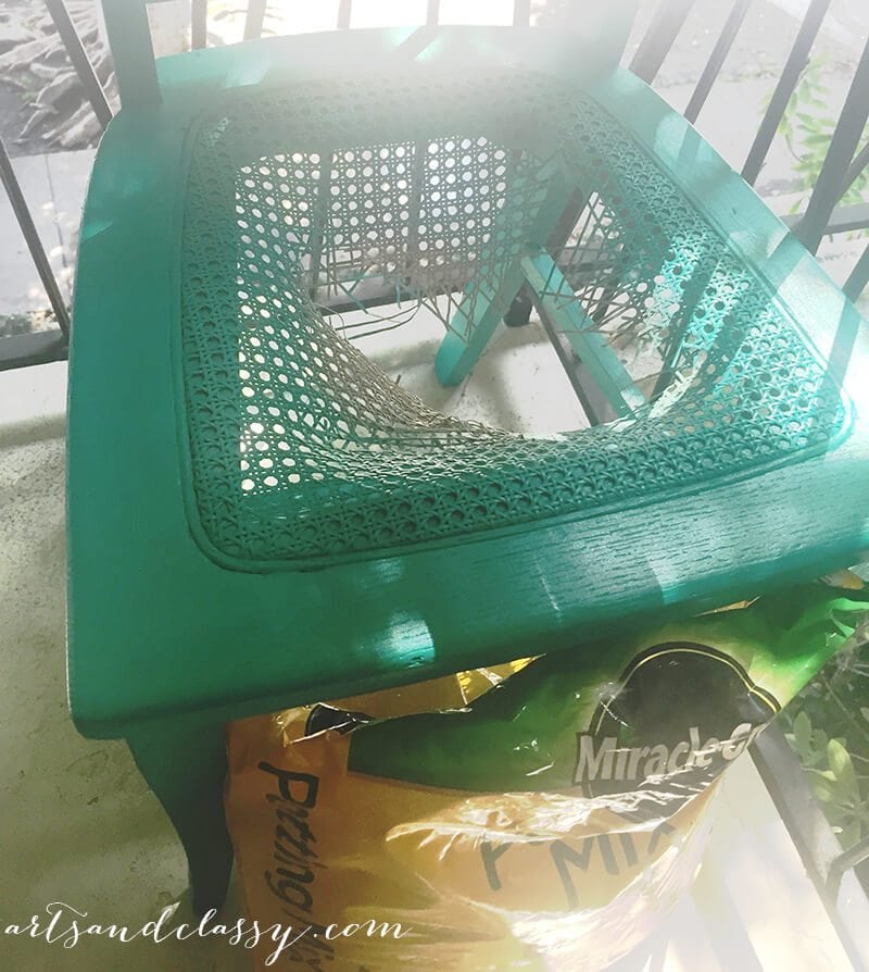 I was considering removing the cane in the seat but decided it could work as an additional support for whatever planter pot I place in the chair and luckily it had a cross brace under the seat that a planter sits perfectly on.